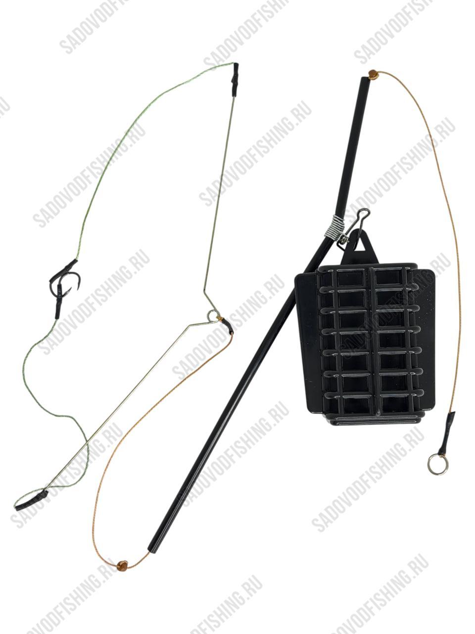 Монтаж рыболовный Posh "Прямоугольник" - используется для ловли на фидерные и донные снасти. Оснастка укомплектована кормушкой. Внутрь кормушки можно набить кашу, жмых и другие прикормки. Данной оснасткой можно ловить в любых водоёмах и абсолютно на любые виды удилищ: удочка, спиннинг, донка, закидушка, фидерное удилище. Корзина кормушки сделана из металла, что делает её достаточно жёсткой. Данная кормушка имеет защитное полимерное покрытие, что позволяет защитить кормушку от коррозии и увеличивает срок её службы. Благодаря своей форме, эта донная кормушка хорошо держит течение и легко всплывает, это позволяет вывести её без зацепа из сложного места ловли.